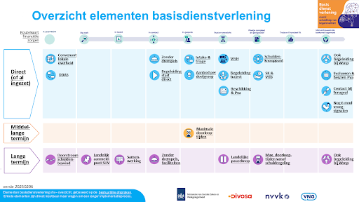 De basisdienstverlening schuldhulpverlening is een gezamenlijk actieplan van het Ministerie van Sociale Zaken en Werkgelegenheid, de VNG, de NVVK en Divosa. Het plan omvat 20 elementen. Een deel is direct uitvoerbaar, terwijl andere onderdelen nadere uitwerking vragen. Het doel is om de schuldhulpverlening toegankelijker, herkenbaarder en gelijkwaardiger te organiseren. Het betreft geen nieuwe wet: gemeenten behouden hun beleidsruimte binnen de Wet gemeentelijke schuldhulpverlening (Wgs), met als gezamenlijke ambitie om sneller rust te creëren, betere begeleiding te bieden en terugval te voorkomen. Ook het Schuldenknooppunt is een element uit de basisdienstverlening.